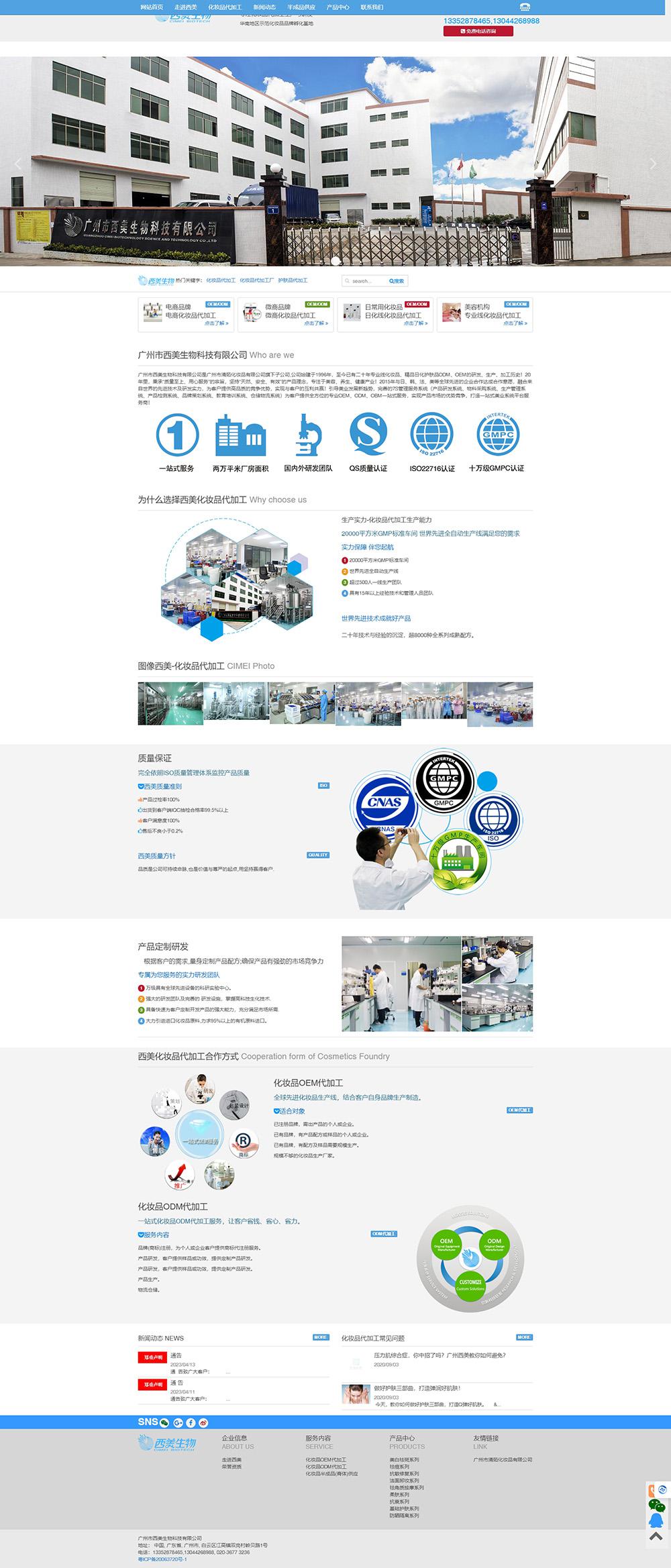 建站联系电话广州市西美生物科技有限公司是广州市清茹化妆品有限公司旗下子公司,公司始建于1996年,至今已有二十年专业线化妆品、精品日化护肤品ODM、OEM的研发、生产、加工历史!20年里,秉承“质量至上、用心服务”的宗旨,坚持“天然、安全、有效”的产品理念,专注于美容、养生、健康产业!2015年与日、韩、法、美等全球先进的企业合作达成合作意愿,融合来自世界的先进技术及研发实力,为客户提供高品质的竞争优势,实现与客户的互利共赢!引导美业发展新趋势,完善的7S管理服务系统(产品研发系统、物料采购系统、生产管理系统、产品检测系统、品牌策划系统、教育培训系统、仓储物流系统)为客户提供全方位的专业OEM、ODM、OBM一站式服务,实现产品市场的优势竞争,打造一站式美业系统平台服务商!