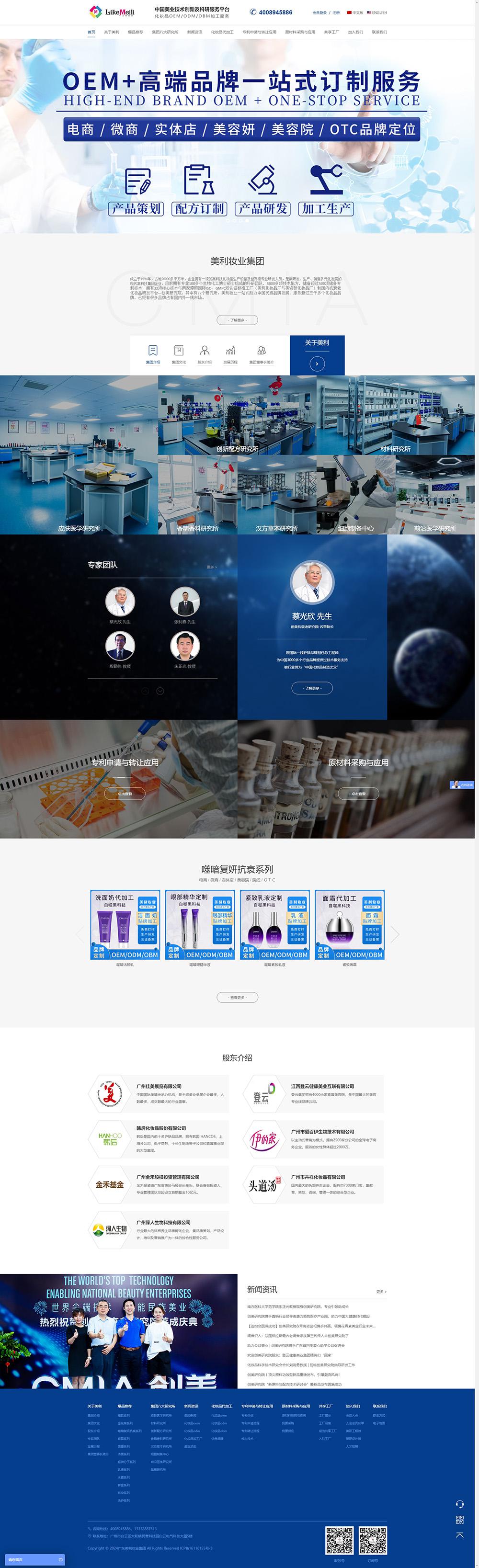 建站联系电话广州美利妆业控股有限公司(简称:美利妆业集团)是一家大型高科技化妆品OEM/ODM生产企业。成立于1994年,占地20000多平方米,企业拥有一流的高科技化妆品生产设备及世界级专业研发人员,是集研发、生产、销售多元化发展的现代高科技集团企业。目前拥有专业100多个生物化工博士硕士组成的科研团队,5000多项技术配方,储备超过500项储备专利技术,拥有32项核心技术与两家遵照国际ISO、GMPC双认证标准工厂(美利化妆品厂与美资贺化妆品厂)和国内抗衰老化妆品研发平台---创美研究院,其中有八个研究所。美利妆业一站式助力中国民族品牌发展,服务超过三千多个化妆品品牌,已经有很多品牌占有国内外一线市场。
