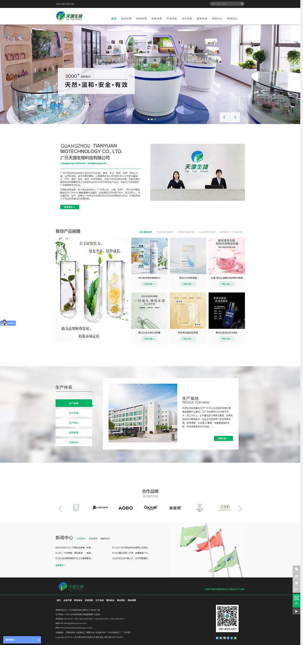 建站联系电话广州天源生物科技有限公司成立于2009年,秉承“专业、务实、创新”的核心价值,以开拓进取、合作共赢的精神,以高素质的核心技术团队和人才优势为基础,以“天然、温和、安全、有效”的研发理念,历经十年的创新与发展,目前已是中国领先的孕婴童及成人化妆品专业OEM/ODM研发生产企业,并在2016年被授予广东省高新技术企业。