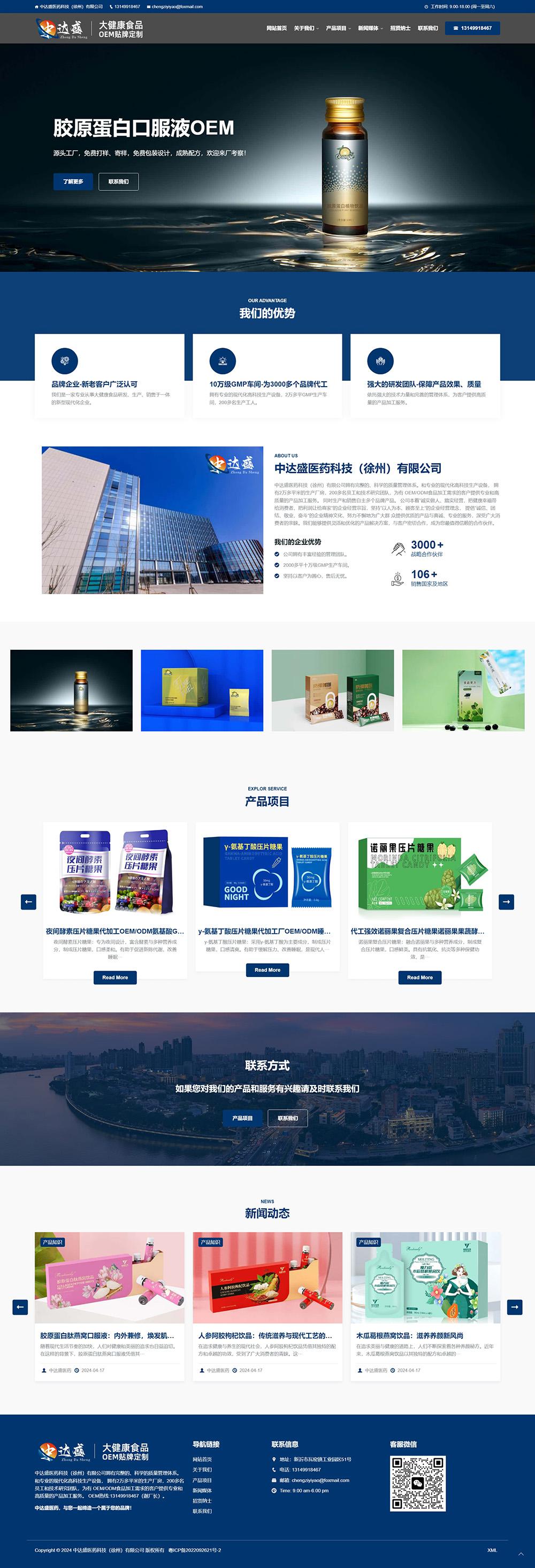 建站联系电话中达盛医药科技(徐州)有限公司拥有完整的、科学的质量管理体系。和专业的现代化高科技生产设备, 拥有2万多平米的生产厂房,200多名员工和技术研究团队,为有 OEM/ODM食品加工需求的客户提供专业和高质量的产品加工服务。 同时生产和销售自主多个品牌产品。 公司本着“诚实做人、踏实经营,把健康幸福带给消费者、把利润让给商家”的企业经营宗旨,坚持“以人为本、顾客至上”的企业经营理念, 提倡“诚信、团结、敬业、奋斗”的企业精神文化,努力不懈地为广大群 众提供优质的产品与真诚、专业的服务,深受广大消费者的亲睐。我们能够提供灵活和优化的产品解决方案,与客户密切合作,成为您最值得信赖的合作伙伴。