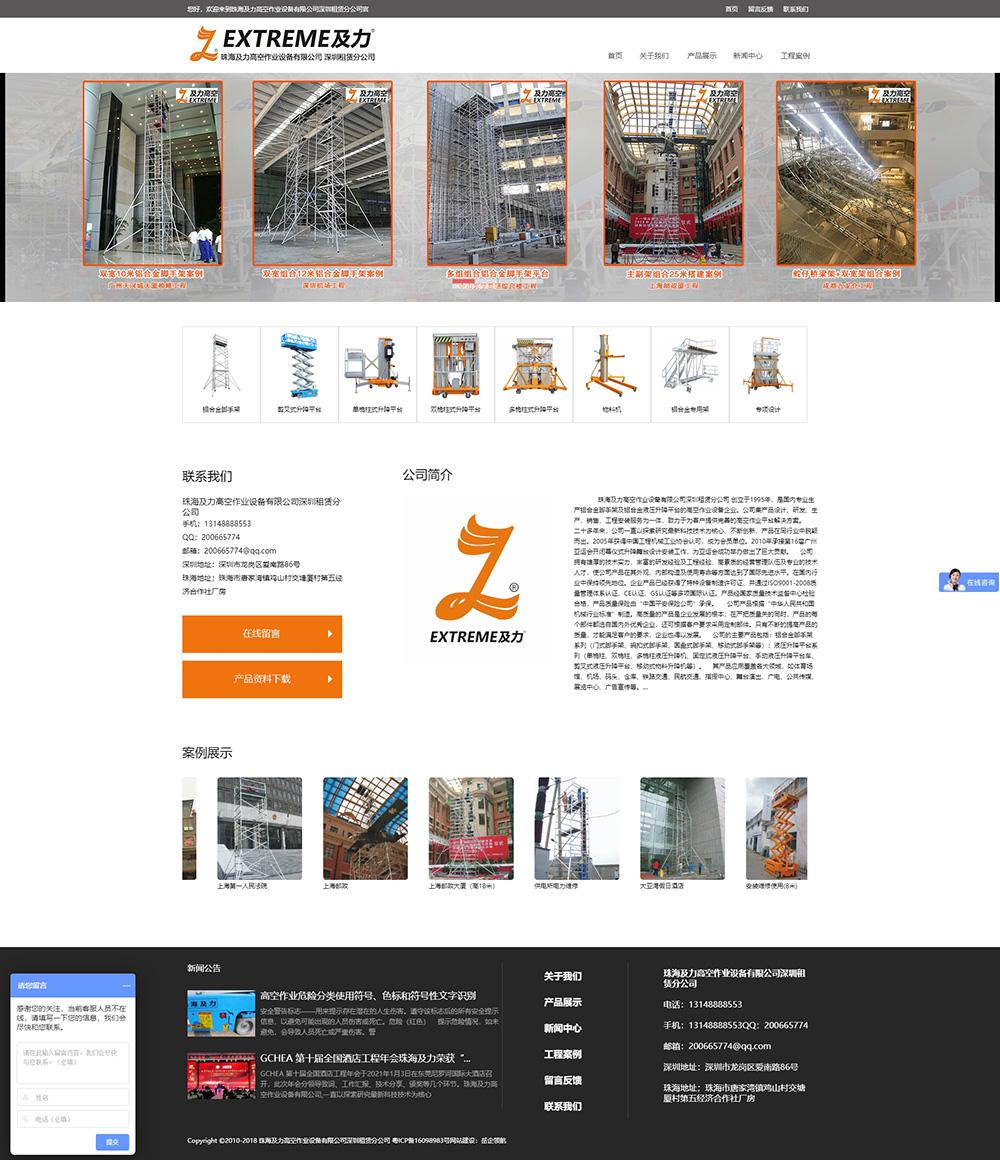 建站联系电话深圳及力高空作业设备有限公司 创立于1995年,是国内专业生产铝合金脚手架及铝合金液压升降平台的高空作业设备企业。公司集产品设计、研发、生产、销售、工程安装服务为一体,致力于为客户提供完善的高空作业平台解决方案。